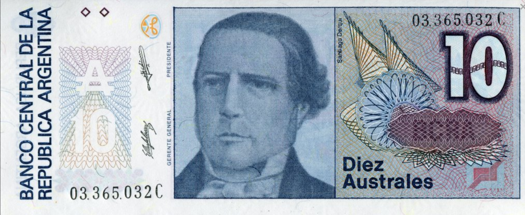 Argentyna 10 australes Santiago Derqu 1985+ P-325b