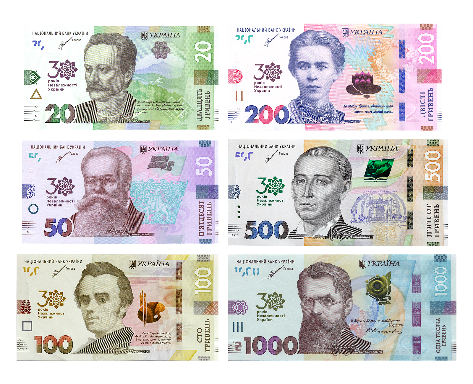 UKRAINA30 lat niepodległości x6 20,50,100,200,500,1000 UAH 2021 P-132-7